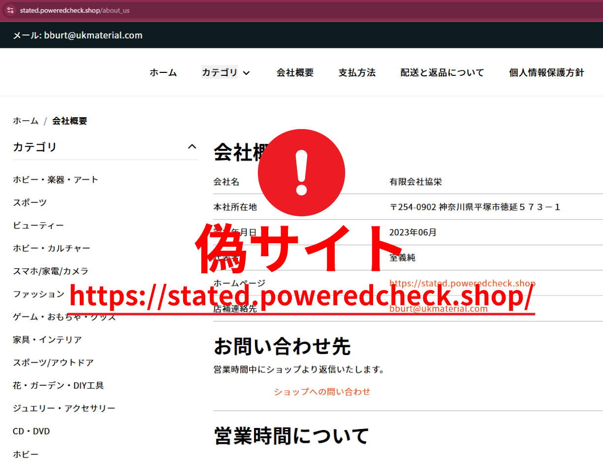 いつも、当店をご利用いただき、誠にありがとうございます。 現在、当店の情報を無断で使用し、 当店と誤認させるようなウェブサイト(なりすましECサイト)を確認しておりますので、ご注意ください。 |
